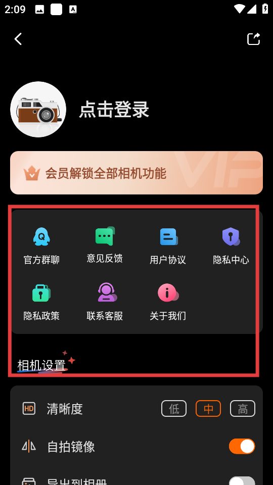 3、在相机界面点击相关入口进入设置与辅助功能界面,这里可以找到官方群聊、意见反馈等选项,方便与开发者及其他用户交流,相机设置里还能调整清晰度等参数。