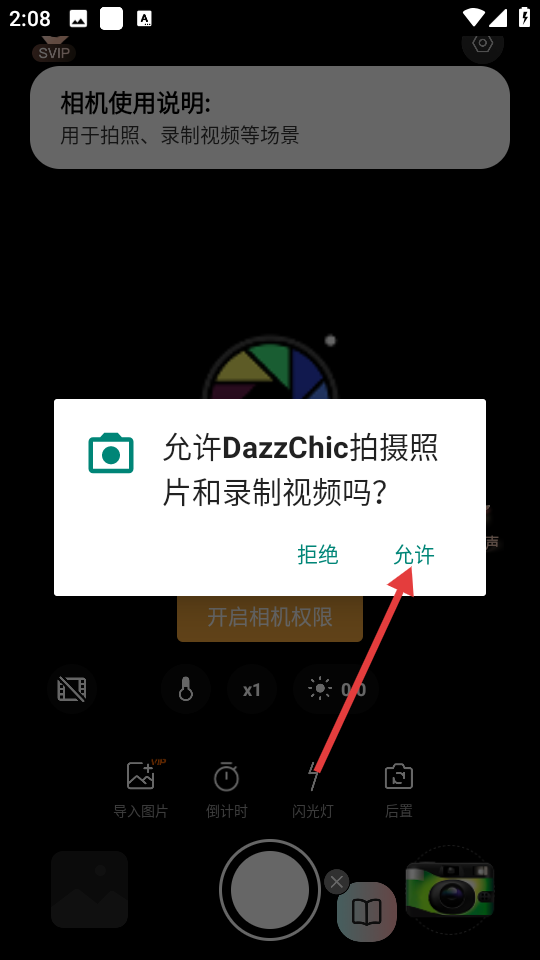 1、首先会弹出相机权限请求框,询问是否允许DazzChic拍摄照片和录制视频,为正常使用拍摄功能点击允许按钮,只有授予权限才能进入相机主界面。