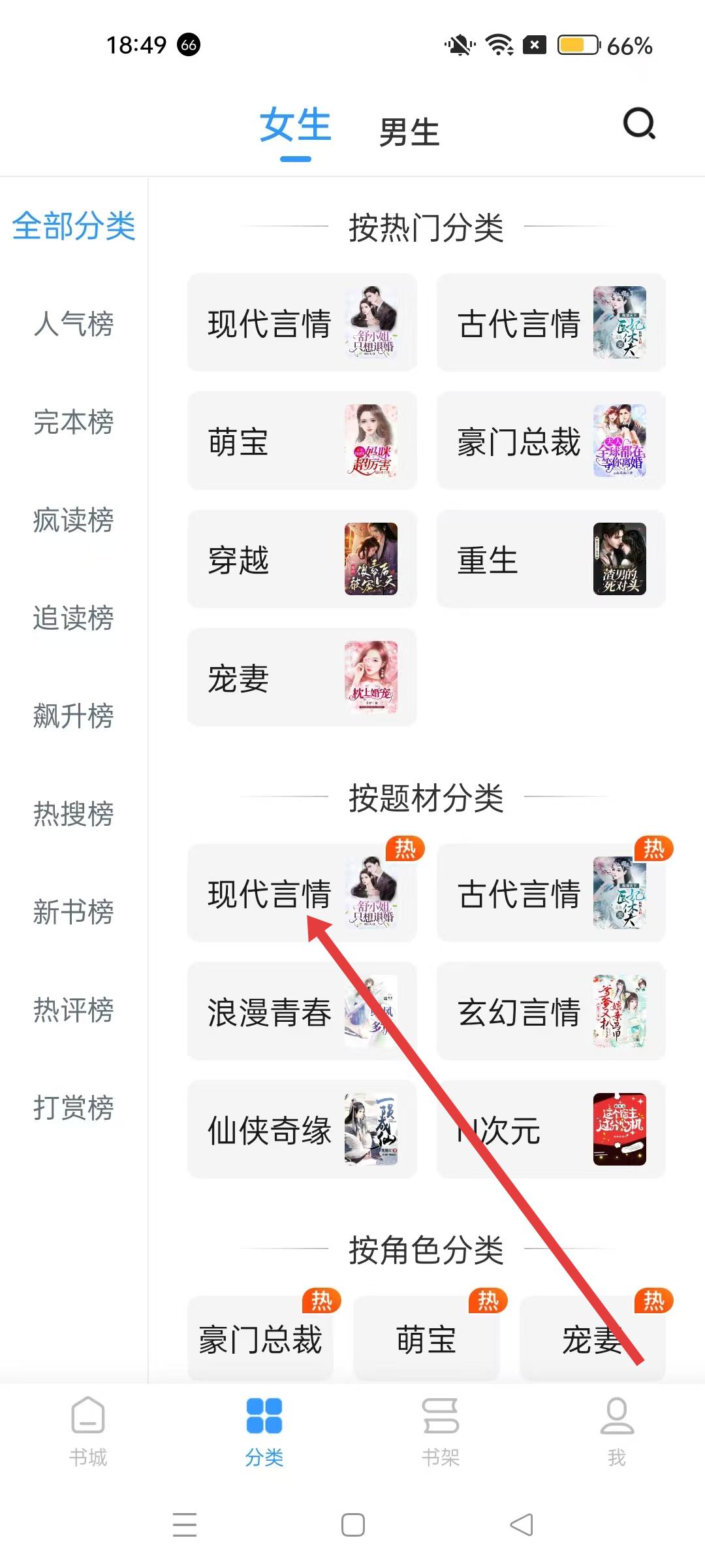 4、分类界面,选择女生标签后,可按热门、题材、角色等分类查找小说,点击现代言情分类,可查看该分类下的小说列表。
