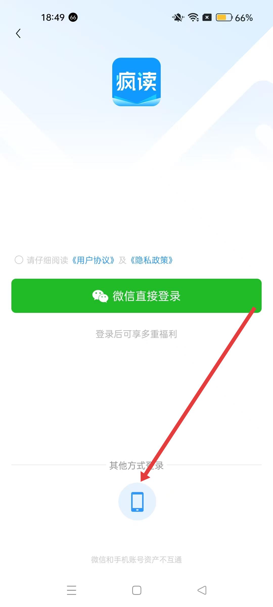 2、点击登录后进入登录选择界面,可选择微信直接登录,也可点击其他方式登录中的手机图标,选择手机登录方式。