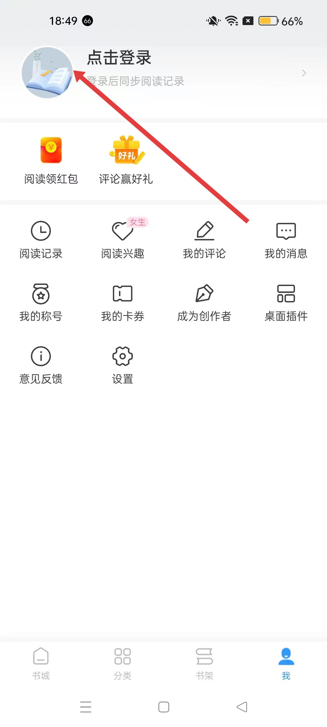 1、进入我的界面,可看到点击登录区域,点击后可开启登录流程,登录后能同步阅读记录,还可参与阅读领红包、评论赢好礼等活动。