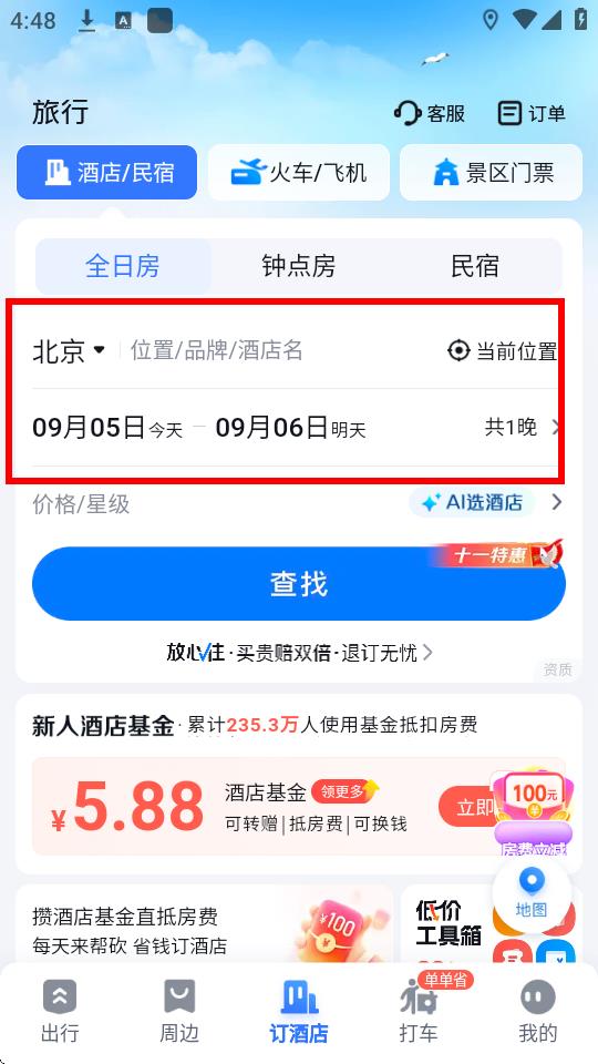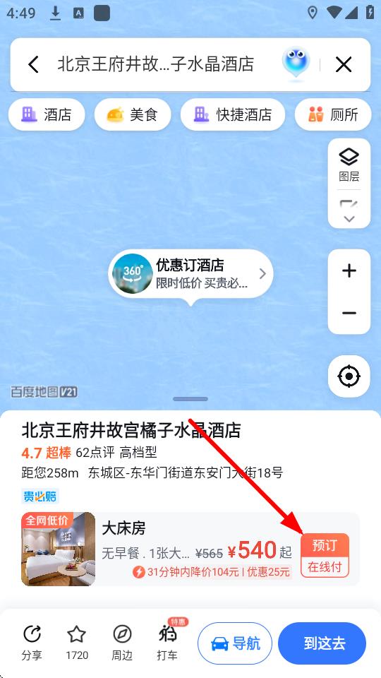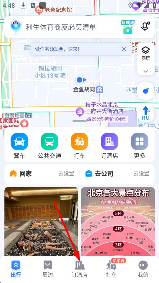1、打开百度地图应用,点击底部导航栏中的订酒店选项,进入酒店预订页面。