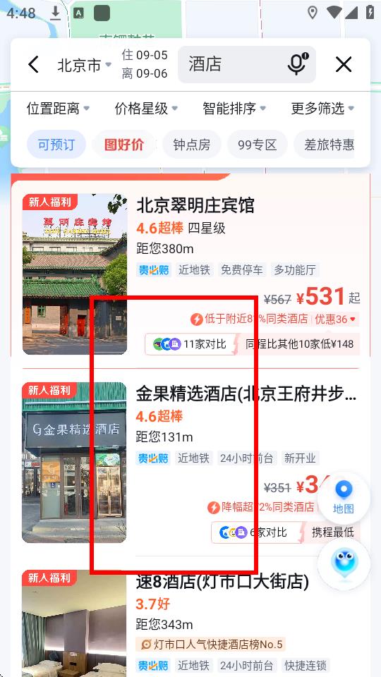 3、设置完成后点击查找,在搜索结果中浏览,选择自己心仪的酒店,比如金果精选酒店。