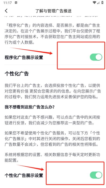 4、最后在了解与管理广告推送界面, 可以将程序化广告展示和个性化广告展示的设置按钮全都关闭即可