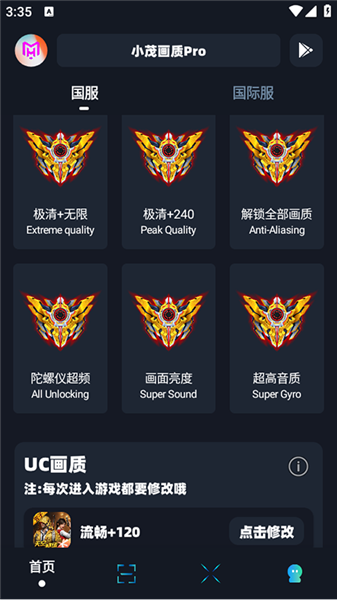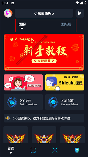 1、在本站内下载安装下载并打开软件,在首页选择“国服”或“国际服”模式。