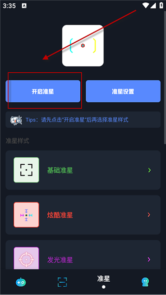 3、点击底部“准星”图标,先点击“开启准星”,再从多种样式中选择适合的准星,设置后在游戏中生效。