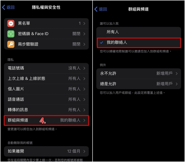 4、最后一个要设定的项目是「群组与频道」,在「谁可以加入我」的地方,将选项更改为「我的联络人」,这样3个地方就都更改完成了。