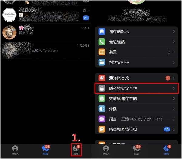1、Telegeram手机版,点击右下角的「设定」>「隐私权与安全性」。