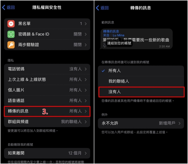 3、接下来要更改的是「转传的消息」,将「在转传消息时谁可以连到我的帐号」选项更改成「没有人」,再点击「返回」到前个页面。