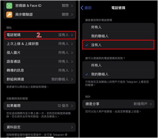 2、在隐私区块中点选「电话号码」,并将「谁能看到我的电话」选项更改为「没有人」,再点击「返回」到上个页面。