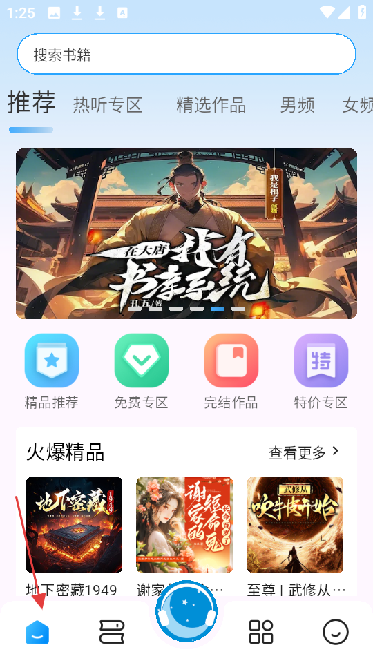 1、首页含搜索功能,推在大唐我有读书系统,设精品推荐、免费专区等板块,火爆精品展热门有声内容。