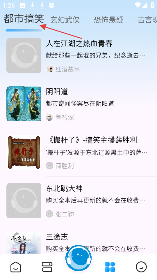 3、分类中的都市搞笑区,有人在江湖之热血青春等作品,汇聚都市题材和搞笑类有声书满足不同趣味需求。