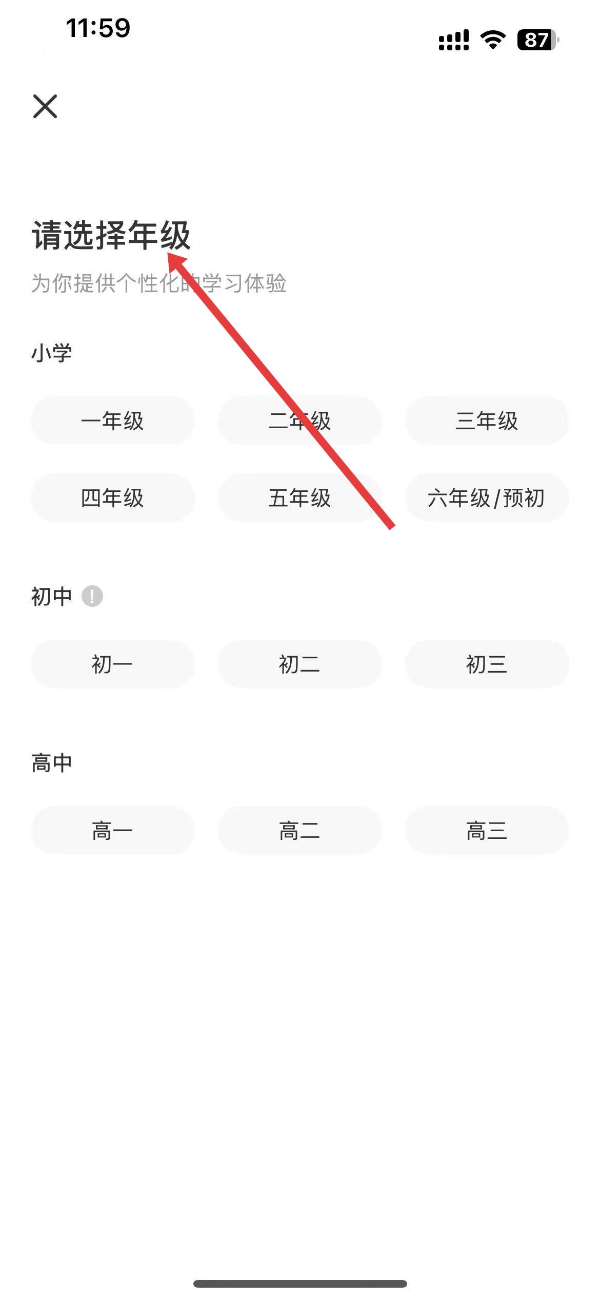1、年级选择界面,可选择小学、初中、高中的不同年级,以便获取个性化学习内容。