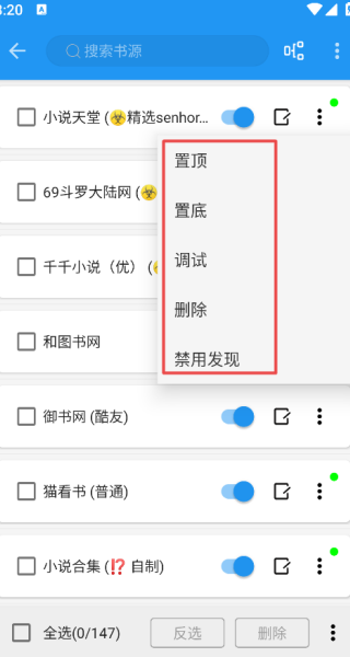 4、点击书源后面的三个点点,能够呼出功能菜单,对书源进行管理!