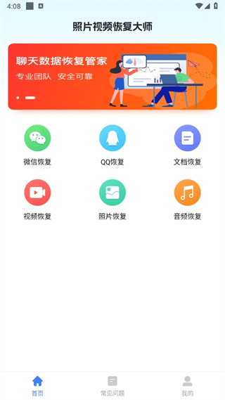 1、打开软件可以进行微信恢复、视频恢复、QQ恢复、照片恢复、文档恢复、音频恢复;