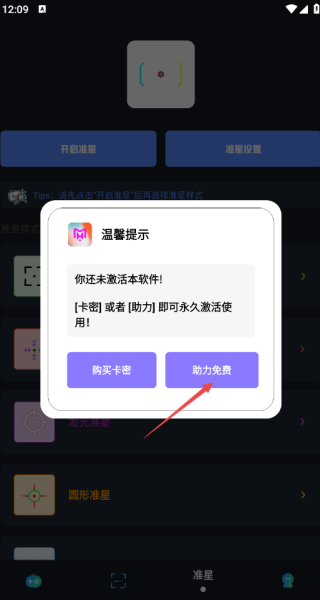 1、这款画质助手的所有功能,都是需要卡密或者免费助力才能使用的,我们选择一个功能,就会出现弹出,点击免费助力;