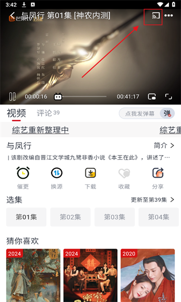 选择自己喜欢的剧集并打开,点击右上方投屏标识,搜索投屏设备