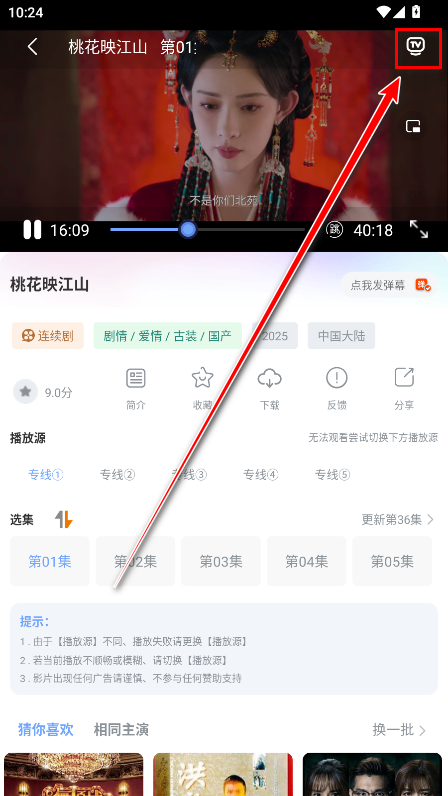 2.点击箭头所指的tv投屏图标。