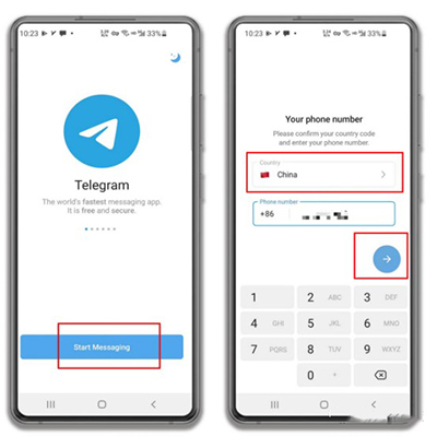安装完成后,打开TG纸飞机。,并点击“Start Messaging”开始注册流程。