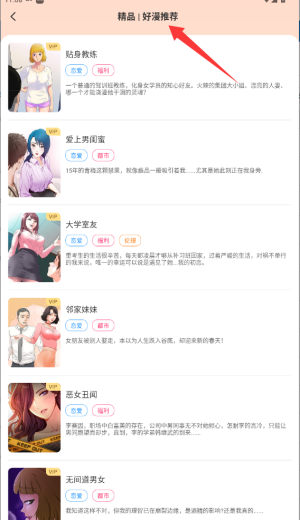 2、浏览漫画列表时,可通过题材标签或人气排行筛选,快速找到喜欢的作品点击封面。