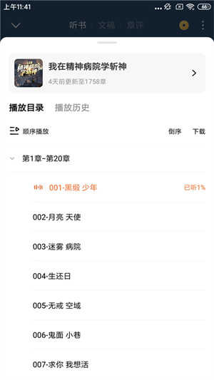 3、可以开始听书了,操作播放界面,可以随时切换章节。