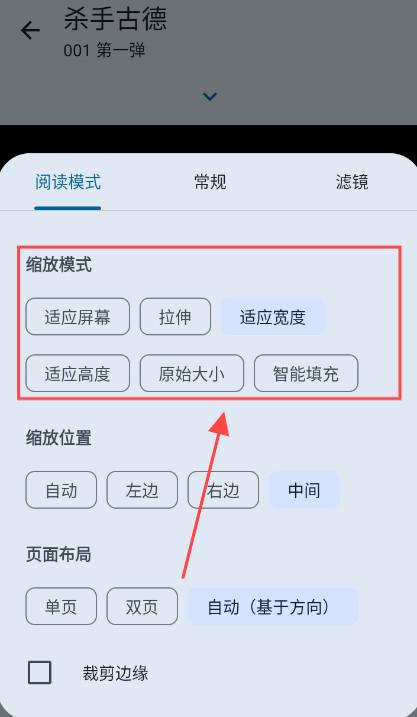 2、阅读模式往下滑,找到缩放模式,选择喜欢的模式即可