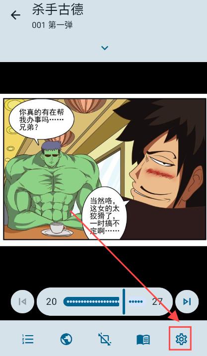 1、在漫画阅读中,点击屏幕中间打开设置界面,点击右下角设置按钮