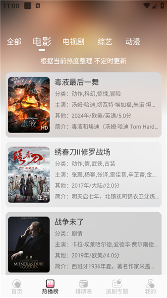 4、排行榜根据当前热度进行整理,帮助用户发现热门影片。