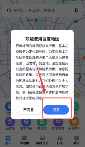 1、阅读并确认服务协议,点击进入公交出行功能主操作界面,开启实时交通信息服务与导航功能。