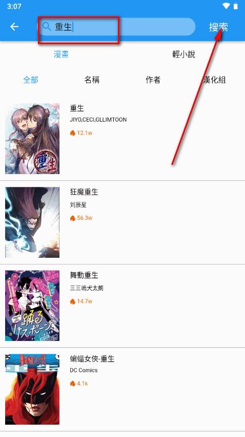 3、点击它,进入搜索框,输入你想找的漫画关键词,然后点击搜索。这样,你就能轻松找到你想要的漫画啦!
