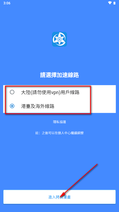1、首先,下载最新版本的拷贝漫画app并安装到你的手机上。打开app后,选择线路,选择港台区,然后点击进入。