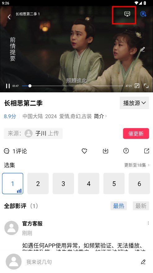 2、选择喜欢的影视剧进行播放,在播放页面,可以直接看到投屏以及下载功能。