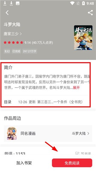 5、选择心仪书籍进入详情页,查看简介、目录结构及更新状态,点击【免费阅读】立即开启沉浸式体验;
