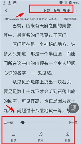 6、阅读过程中轻点屏幕中央,即可快速调出功能面板——支持一键切换目录、开启听书、离线缓存、启用夜间模式等个性化操作。