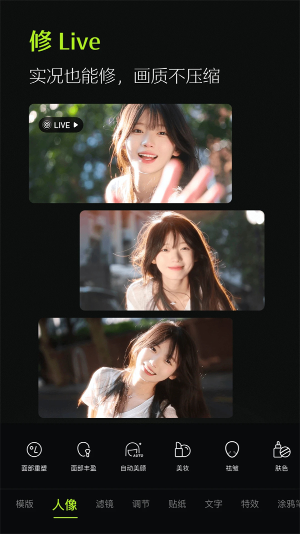 质地肌肤一键美容,一键操控,肌肤质地天然,不显虚伪,轻易打造出好的肌肤;