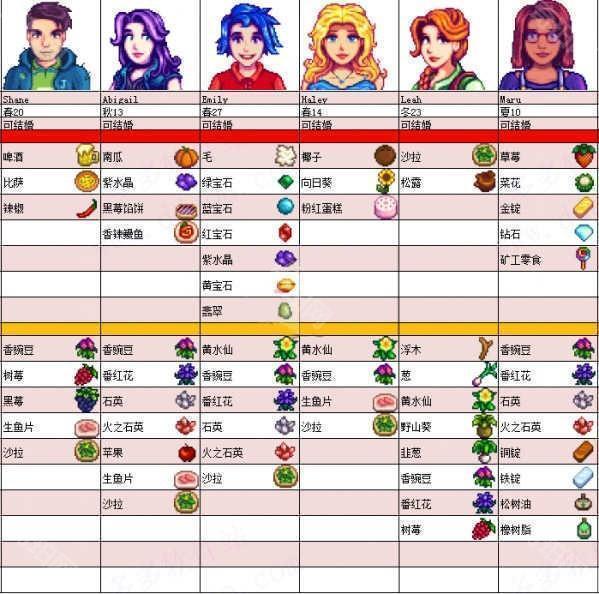 4、阿比盖尔:是一个叛逆性的女孩,最喜欢器材碎片、兔子的脚、黑莓馅饼、巧克力蛋糕、河豚、紫水晶、南瓜,喜欢所有宝石、料理、工业品、花、不喜欢所有的鱼、手工艺品、矿产、建筑材料等,讨厌所有的蛋、垃圾、鱼饵、牙签、海藻等。