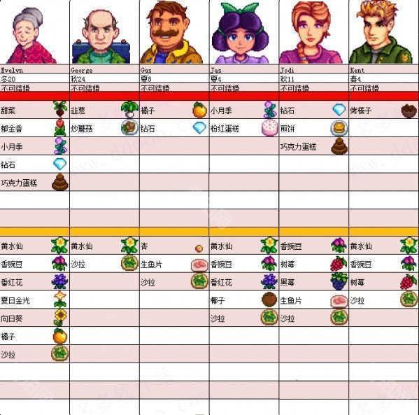 3、哈维,小镇里的医生,梦想当飞行员,但是恐高,最喜欢能量餐、龙虾浓汤、松露油、幸运兔脚、咖啡,喜欢所有的宝石、料理、工业品、蔬菜、水果,不喜欢所有的手工艺品、小麦粉、松焦油、黏土、石头,讨厌垃圾、野草、罂粟等。