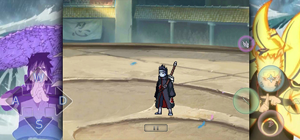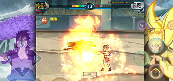 6、等待一会加载即可正式进入游戏,游戏内左边为移动键,右边为攻击键、技能键、闪避键、跳跃键、以及释放忍术卷轴和通灵兽;