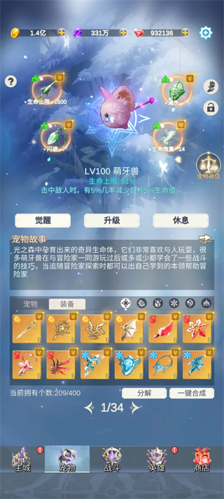 宠物优先选择生命(橙宠),搭配一个暴击宠与一个暗属性宠;300关后,暗属性宠建议替换为命中宠。