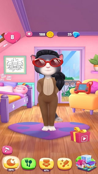 安吉拉也是需要美美的!除了日常的梳毛外,我们可以在化妆间里面,帮助安吉拉涂口红、涂眼影、画眉毛,每个化妆品都有不同的颜色和样式,我们可以打造安吉拉的独特风格。只有你想不到,没有游戏做不到。我们在游戏中可以帮助安吉拉换肤色,换发型,或者换日常的服装,衣服的款式非常多,总有一款你喜欢。
