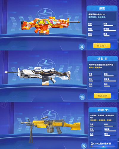 除了传统形态的M249外,你还可以通过改装、涂装等方式,为自己的爱枪提升更多功能!目前有三款枪皮,分别是:爆震/信条-狂/荣耀M249。