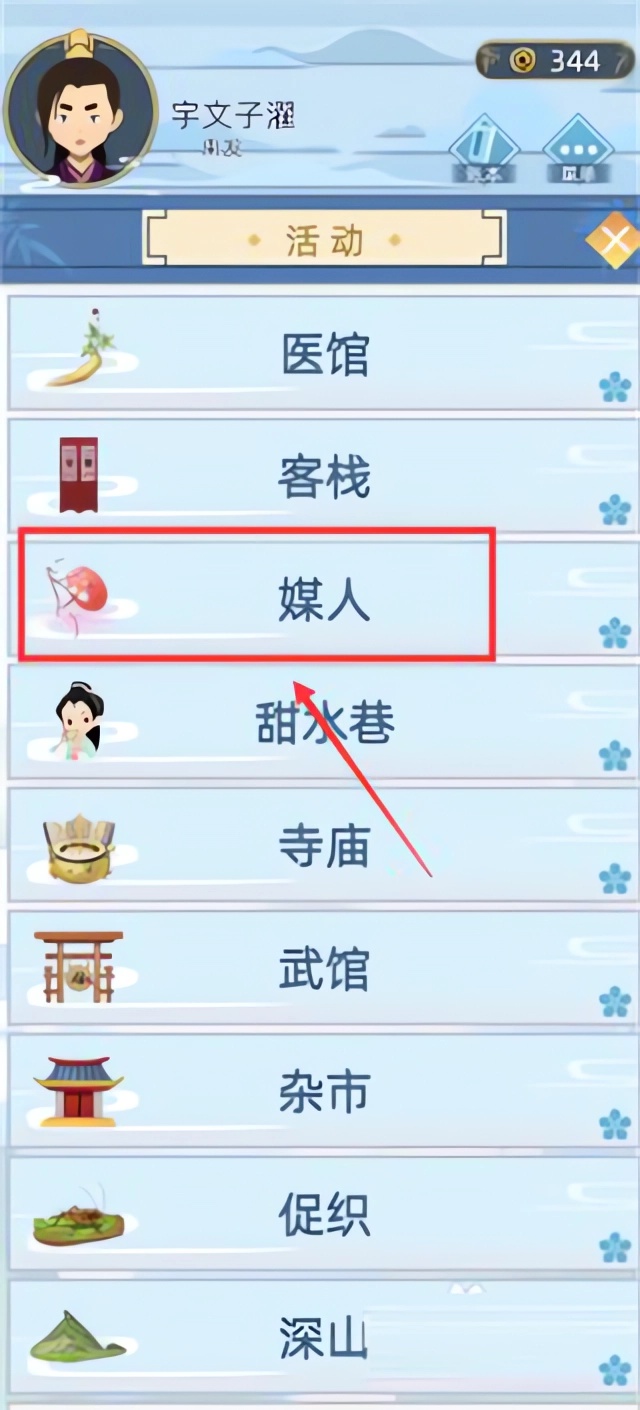 3、在【活动】菜单中定位到【媒人】入口,并点击进入该交互界面,如图所示操作;