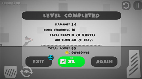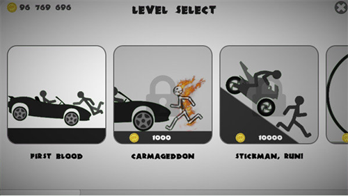 3、通过车辆撞击火柴人来获得奖励,伤害得越多奖励越高,不过要小心控制车辆,速度太快容易翻车哦。