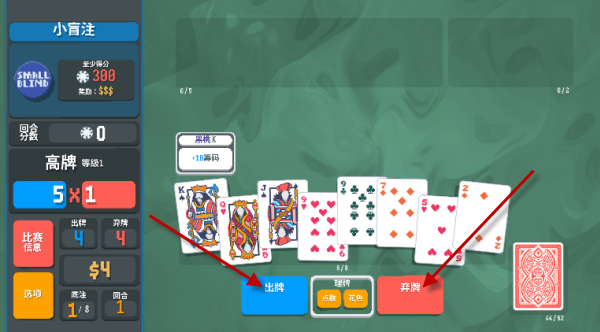 5、屏幕下方左侧的蓝色按键可以进行出牌,点击右侧的红色弃牌按键可以进行弃牌,来获得全新的牌。