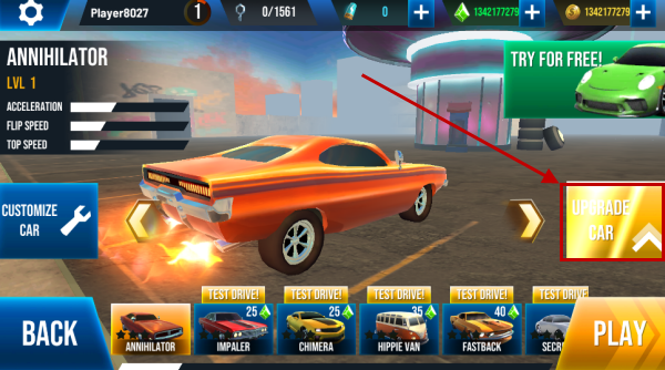 1、回到我们的主界面,点击屏幕右侧的UPGRADE CAR按键。