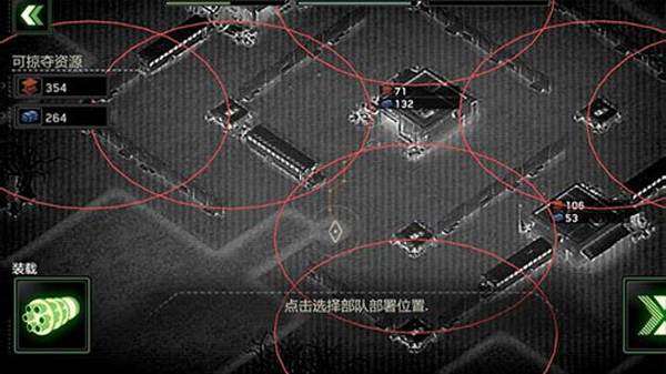 3、开始任务后,需要先设置『部队部署』位置,红圈内为高塔区,不能部署此处,建议观察『可掠夺资源』的周边建筑,计算每个障碍物的离资源点的距离,以及任务目标要求是什么,尽量完成目标以获取更多的资源,当然任务在前期都很好胜任,获得的宝箱可以开出5.56毫米机枪、MP5冲锋枪或是火炮等装备,以及等级经验,点击『战队图标』可查看全部武器以及设施,红色代表未获得。