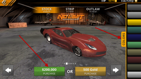 3、我们可以点击左边的这个按钮来进行购买,在屏幕的右侧,点击COLORS还可以选择赛车的颜色。