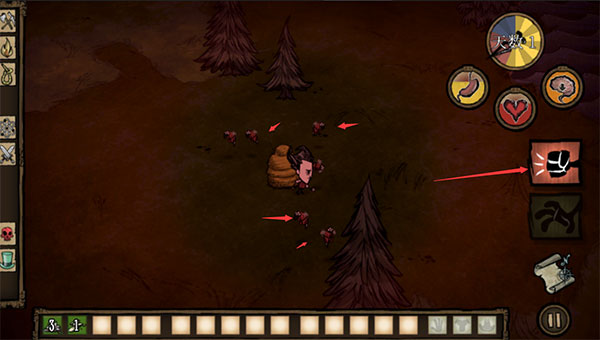 8、该游戏最有特色的还是它的天气状态,并且游戏有饥饿、白天黑天等设置,玩家可以生火、可以建造庇护所等,黑夜一定要点燃火把,不然会被血条会一直掉,坚持活下去。