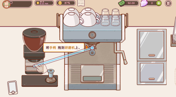 1、我们要在准备室为顾客准备咖啡,将手柄拖到咖啡研磨机上。