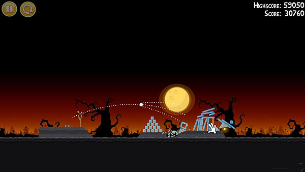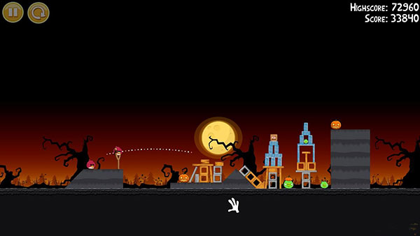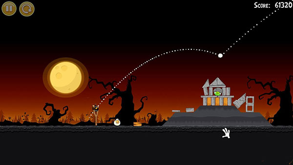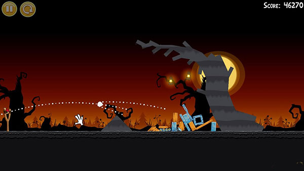 1-6:第一只鸟朝图中轨迹位置,击中左下角,干掉一个南瓜头,第二只鸟同样以一定角度斜插南瓜位置,(三星绝对拼人品,重复尝试了70多篇啊,苦逼有木有啊)